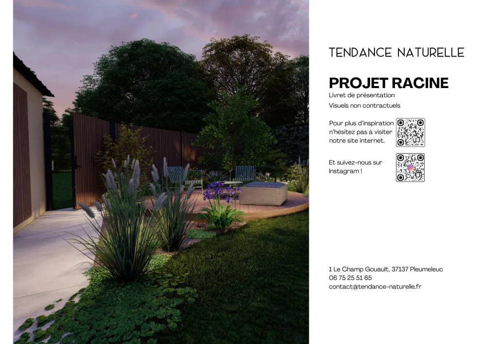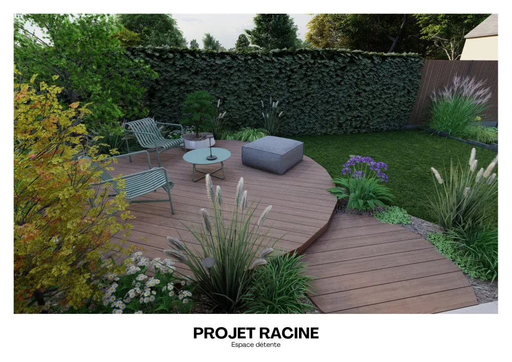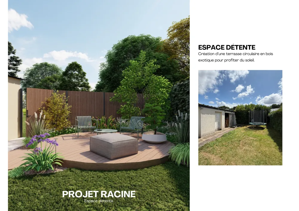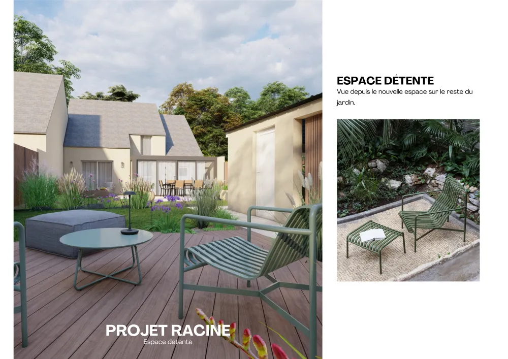 Votre paysagiste Tendance Naturelle🐞 vous présente ce magnifique projet de conception pour un petit jardin avec la création de différents espaces terrasses et d’un espace détente : le projet Racine.