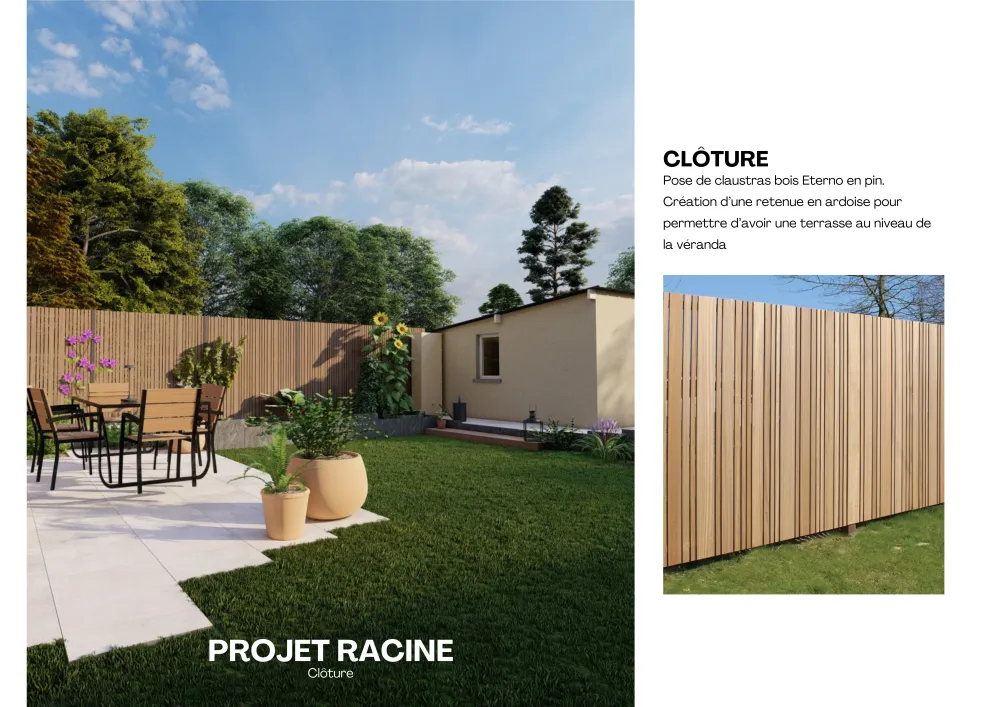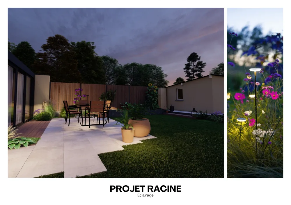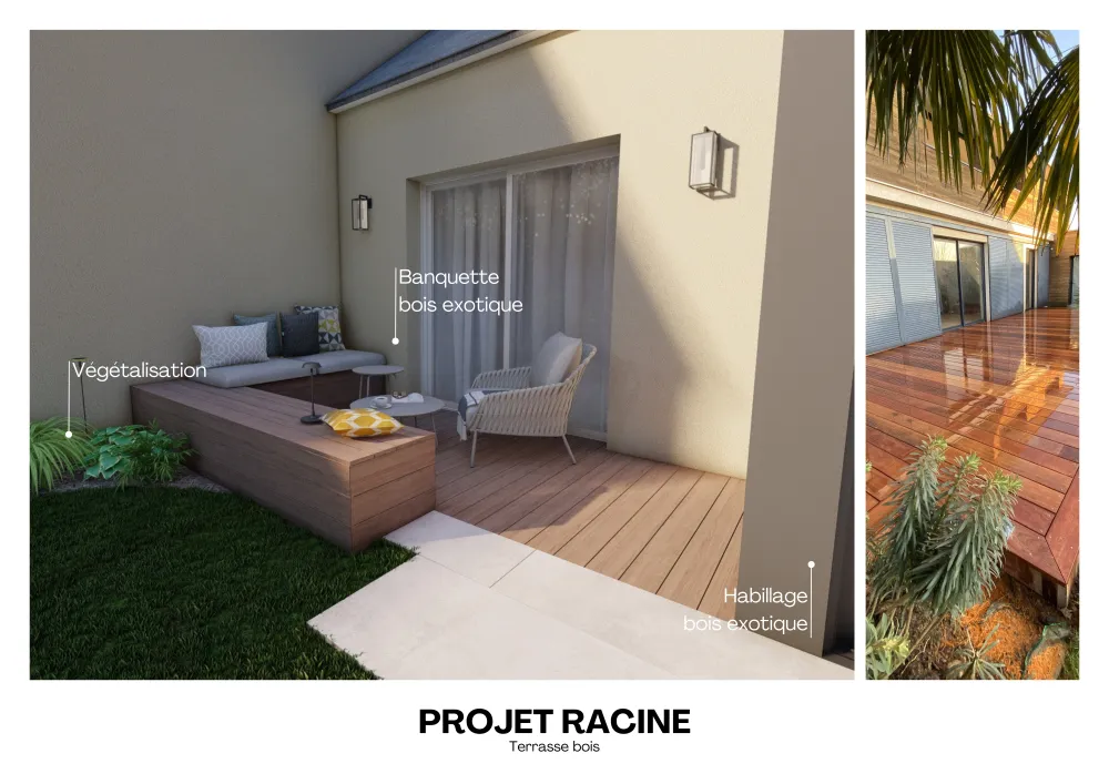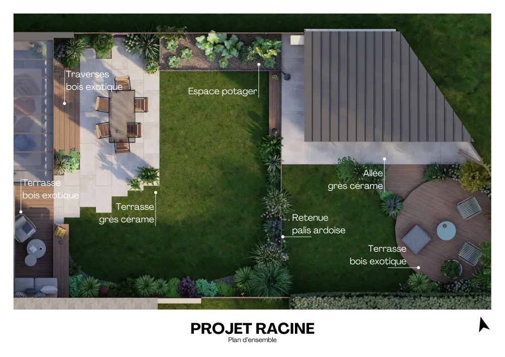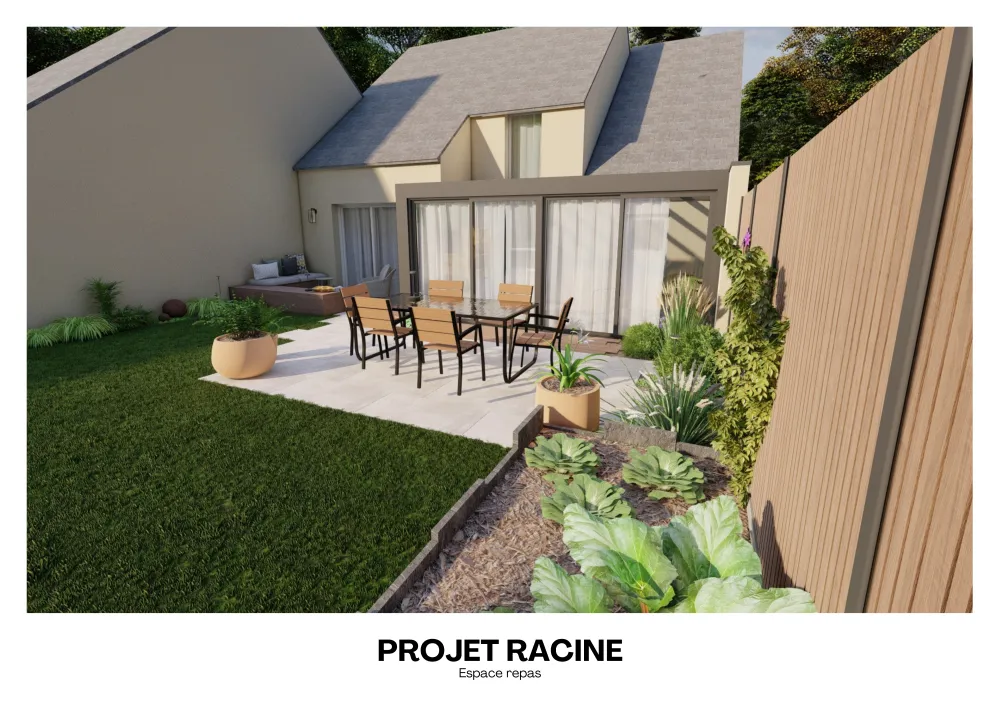 Votre paysagiste Tendance Naturelle🐞 vous présente ce magnifique projet de conception pour un petit jardin avec la création de différents espaces terrasses et d’un espace détente : le projet Racine.